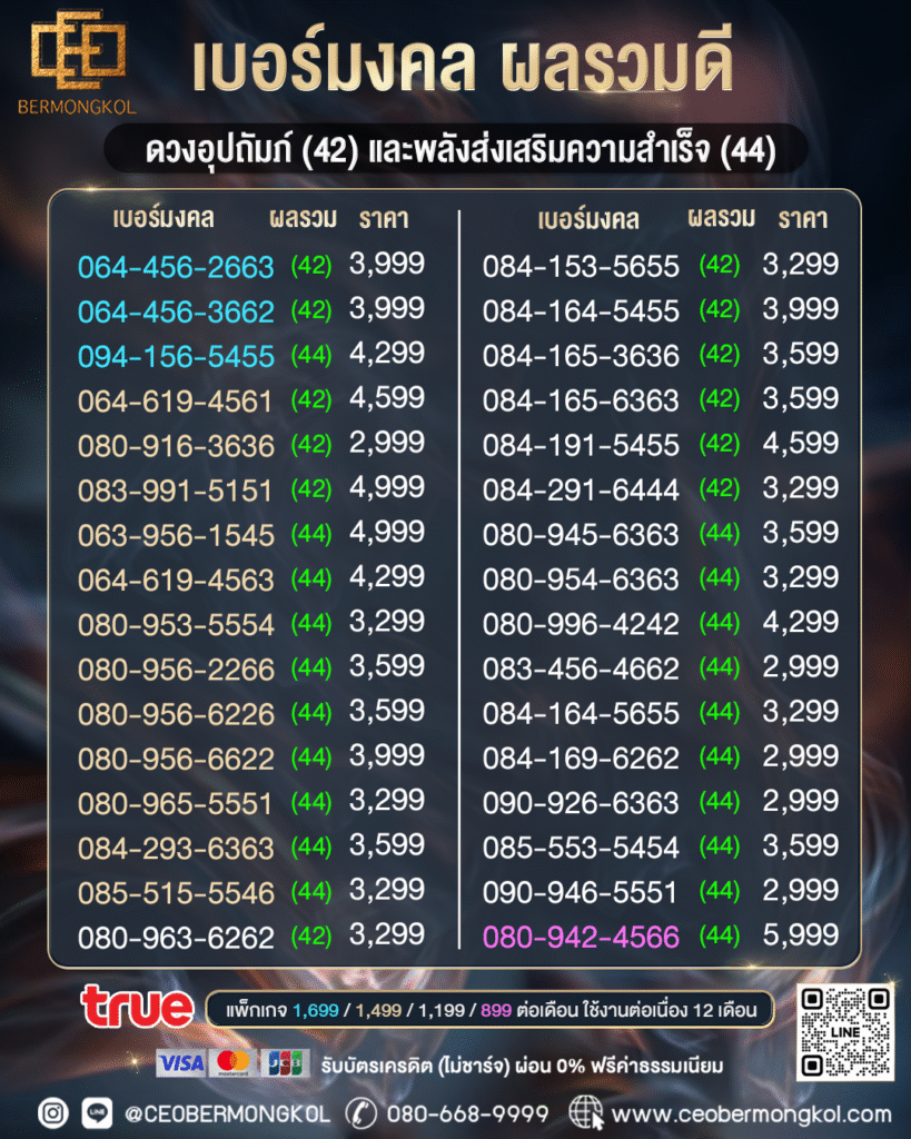 ร้าน CEO Bermongkol เป็นร้านค้าชั้นนำที่จำหน่าย เบอร์มงคล โดยผู้เชี่ยวชาญด้านศาสตร์เลข ที่คัดสรรเบอร์มงคลอย่างพิถีพิถันเพื่อเสริมโชคเสริมดวงให้กับลูกค้า โดยเฉพาะ เบอร์มงคลทรู ที่มีความหมายดีและสามารถเสริมพลังบวกในด้านต่างๆ ไม่ว่าจะเป็นการงาน การเงิน หรือความรัก เบอร์ของเรามีทั้ง เบอร์สวย ที่มีรูปแบบที่น่าสนใจและเหมาะสมกับทุกไลฟ์สไตล์ รวมถึง เบอร์ดี ที่ได้รับการวิเคราะห์และปรับแต่งตามหลักศาสตร์เลขเพื่อให้ลูกค้าทุกท่านได้รับประโยชน์สูงสุดจากการใช้เบอร์มงคลที่มีความหมายดี