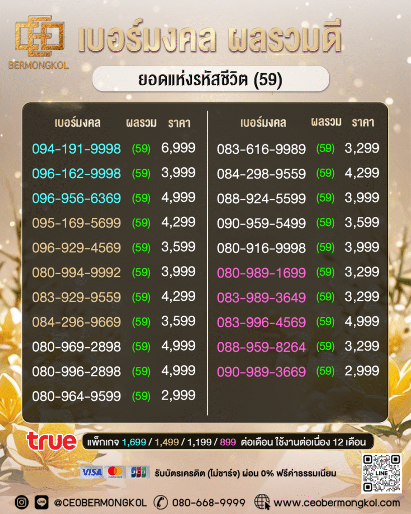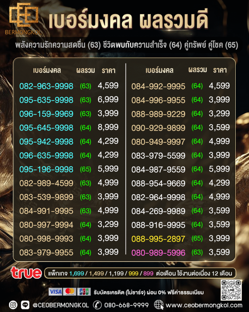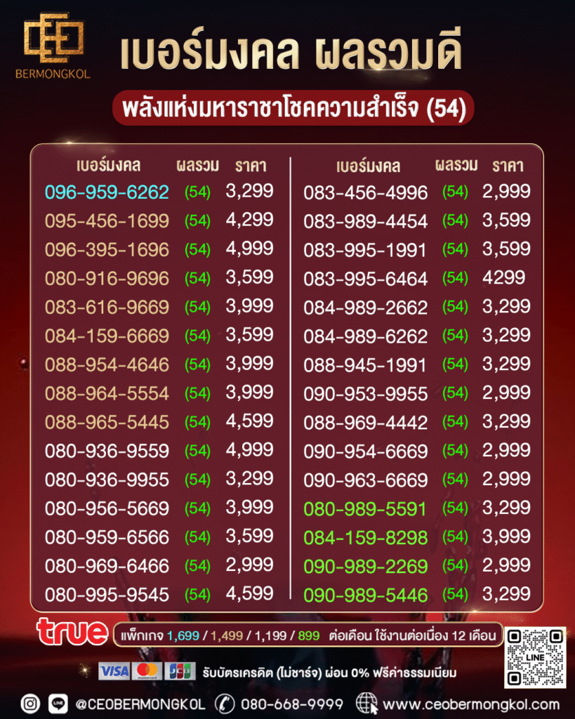 ร้าน CEOBERMONGKOL เป็นร้านค้าชั้นนำที่จำหน่าย เบอร์มงคล โดยผู้เชี่ยวชาญด้านศาสตร์เลข ที่คัดสรรเบอร์มงคลอย่างพิถีพิถันเพื่อเสริมโชคเสริมดวงให้กับลูกค้า โดยเฉพาะ เบอร์มงคลทรู ที่มีความหมายดีและสามารถเสริมพลังบวกในด้านต่างๆ ไม่ว่าจะเป็นการงาน การเงิน หรือความรัก เบอร์ของเรามีทั้ง เบอร์สวย ที่มีรูปแบบที่น่าสนใจและเหมาะสมกับทุกไลฟ์สไตล์ รวมถึง เบอร์ดี ที่ได้รับการวิเคราะห์และปรับแต่งตามหลักศาสตร์เลขเพื่อให้ลูกค้าทุกท่านได้รับประโยชน์สูงสุดจากการใช้เบอร์มงคลที่มีความหมายดี