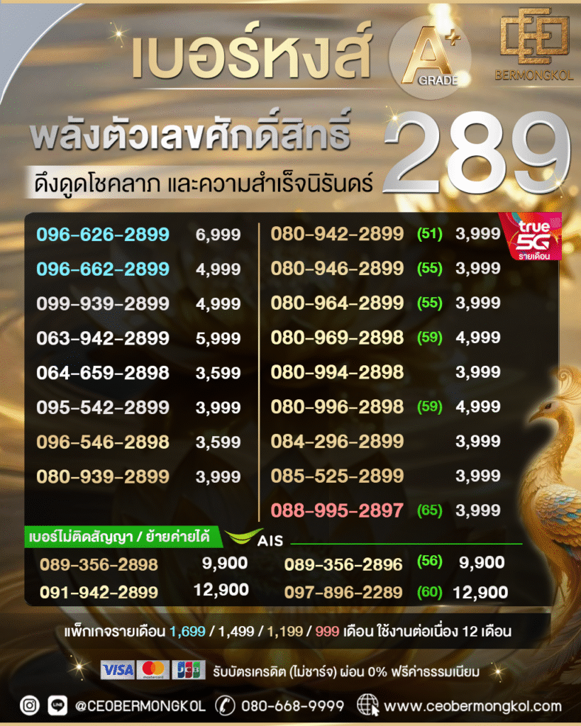 เบอร์มงคลคัดพิเศษหงส์ศักดิ์สิทธ์ 289 เครือข่าย True แบบรายเดือน และ AIS ระบบเติมเงิน เกรด A+